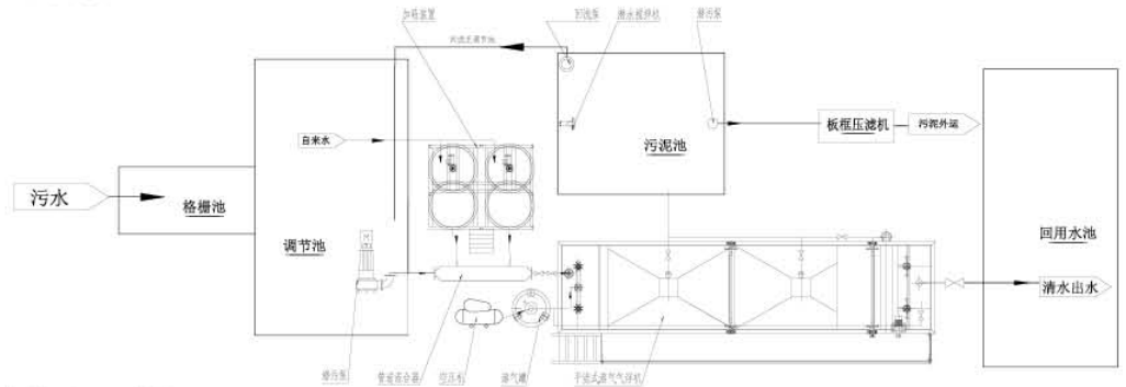 工作原理:在一定條件下,將大量空氣溶于水中,形成溶氣水,作為工作介質(zhì),通過釋放器驟然減壓快速釋放,產(chǎn)生大量微細氣泡粘附于經(jīng)過混凝反應(yīng)后廢水中的“礬花”上使絮體上浮,從而迅速地除去水中的污染物質(zhì)達到凈水的目的,詳見工藝流程圖。