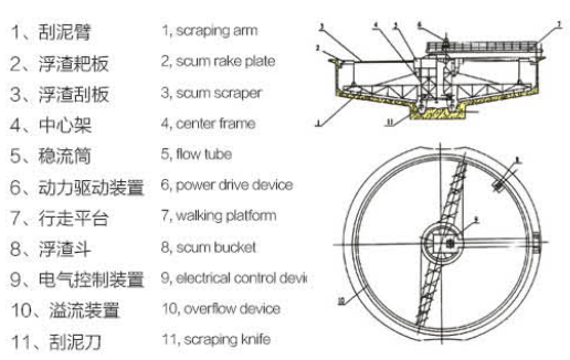 特點:該機采用中心傳動垂架式,下部采用整體對數螺線刮 板,上部設有浮渣收集裝置,池壁四周設溢流裝置及浮渣 排出裝置。該機傳動機構為行星擺線針輪減速機與帶外齒 的大型回轉支承二級減速具有傳遞扭矩大,運轉平穩,穩 流效果好等優點。