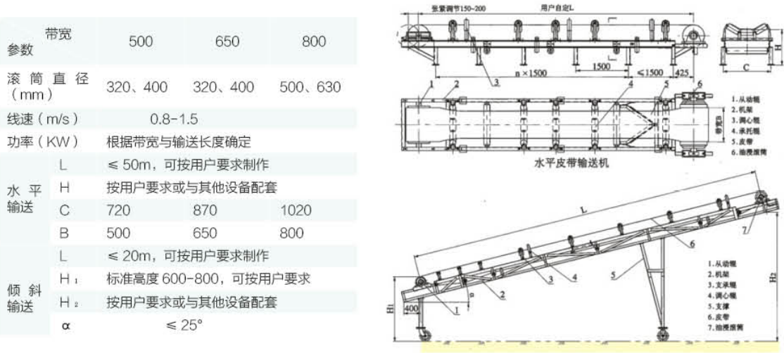 用途:帶式輸送機主要用來輸送顆粒或粉末狀固體,用于環保上主要用于輸送柵渣,脫水后的泥餅、泥沙等。